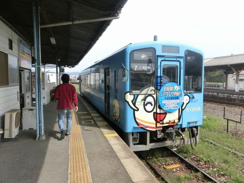 バイキング列車の終わり 途中の田川伊田駅にて停車中。 この駅でもまた、7分ほどの長めの停車です。 たびたびこういった停車が発生してますが、その駅ごとの特徴なども案内してくれるので飽きませんね(笑) 連絡通路後がありました。 階段で降りたところにト…